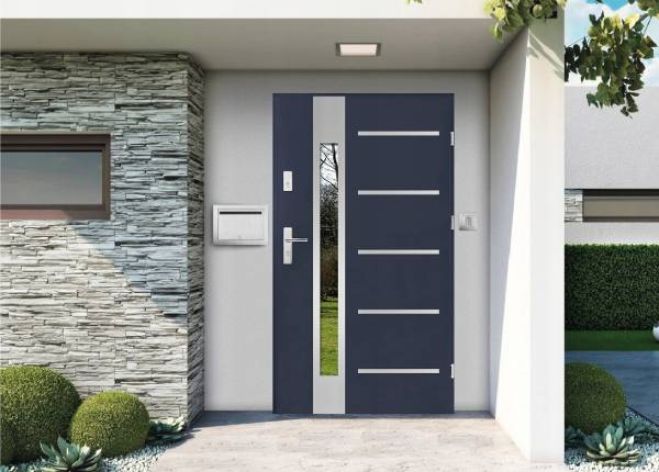 Стильная металлическая дверь была установлена на входе в частном доме. Дверь изготовлена из стали, дверное полотно имеет толщину в 1 мм. Такая толщина выдерживает удары кувалдой, поэтому металлическая дверь в доме является очень прочной и взломостойкой. Такая дверь сочетает в себе надёжность и красоту. Внешняя сторона двери имеет несколько декоративных элементов в виде вставок из металла другого цвета, узкую полоску зеркала. Общий цвет металлической двери — тёмно-серый, вставки хромированные и бежевая. Двери из металла обычно довольно тяжелые, поэтому данная конструкция имеет 3 петли для того, чтобы со временем дверь не провисла.
